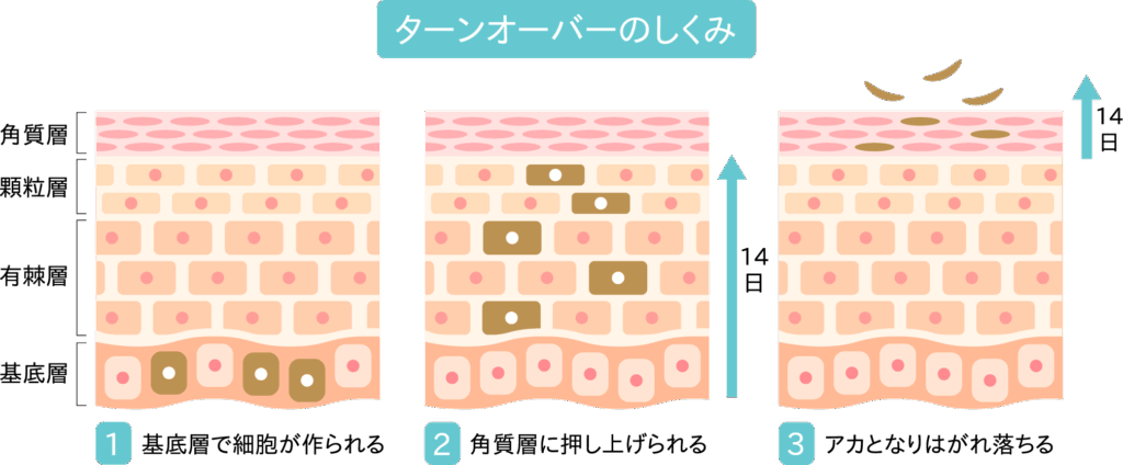 本来であればターンオーバー(肌の新陳代謝)によって古い角質とともにメラニンは排出されますが、